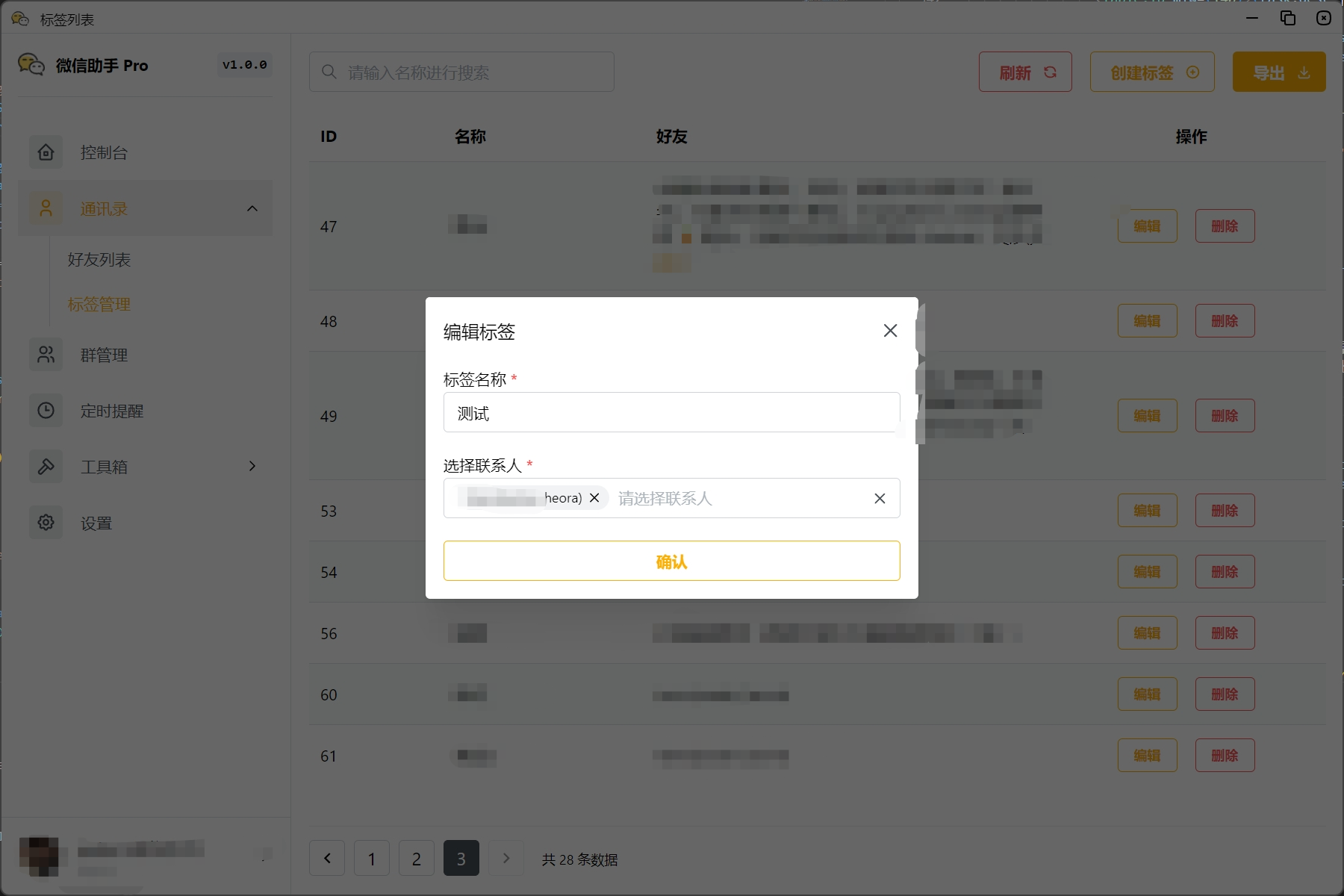 功能介绍通讯录本页总览通讯录 通讯录功能可以帮助您管理微信好友,包括查看好友信息、添加好友、删除好友、发送消息、好友分组、文件导出等。 好友列表 列表页 好友列表,支持查看微信号、昵称、备注、头像、性别、省份、城市、标签、是否已被删除等信息。 添加好友 支持多种方式发起好友申请。 “群聊搜索” 添加好友 “微信号/手机号搜索” 添加好友