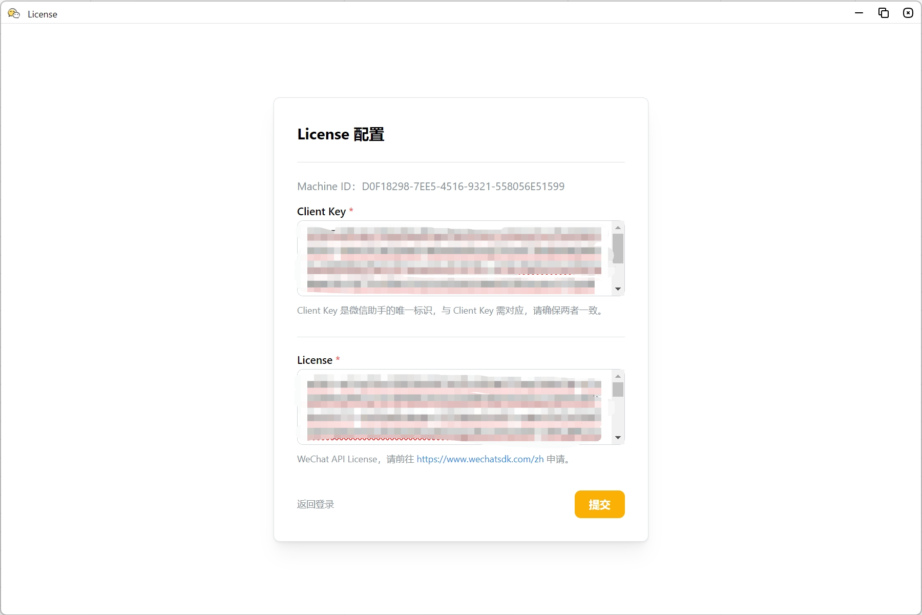 - 授权码(Client Key):需要联系 微信助手 Pro 客服获取。